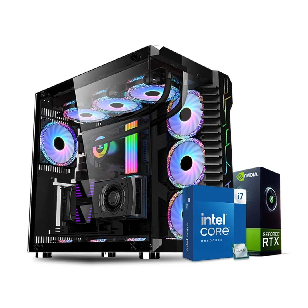 A fully built, RGB-lit gaming desktop featuring an unlocked Intel Core i7 processor, NVIDIA GeForce RTX graphics card, liquid cooling with multiple ARGB fans, tempered glass case, and high-speed RAM/SSD—optimized for 4K gaming, content creation, and extreme performance.