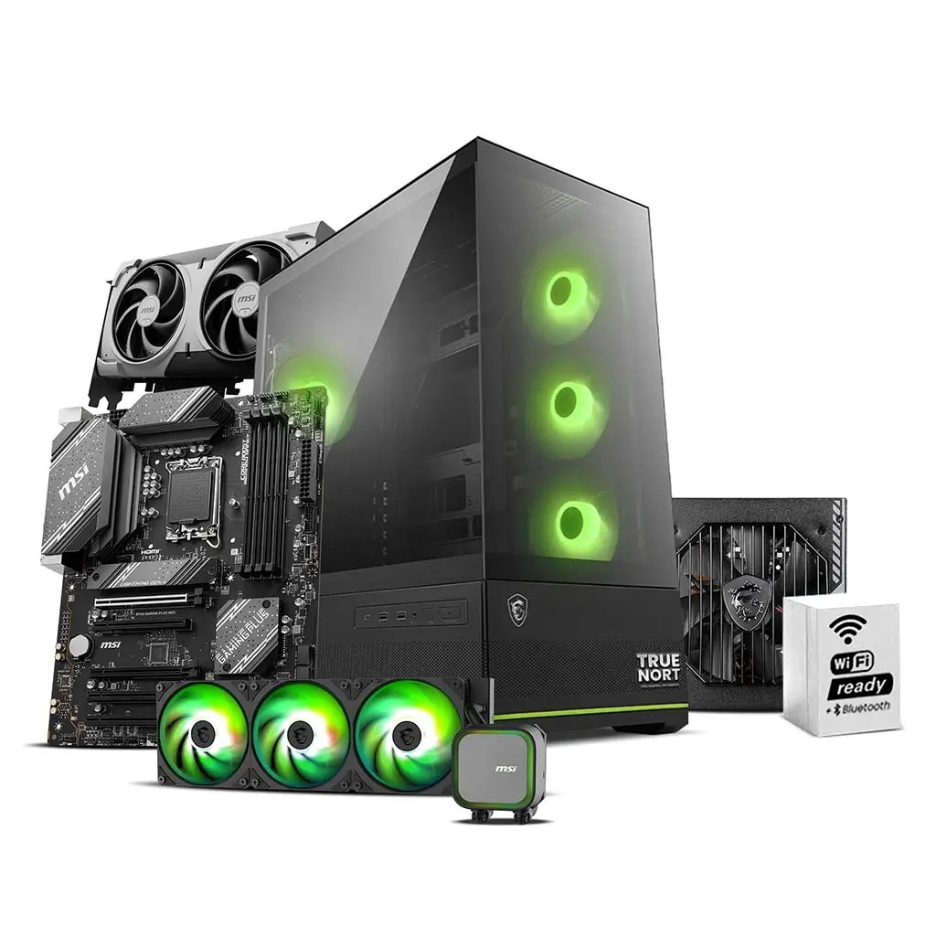 A high-performance gaming PC component bundle featuring an MSI Z790 motherboard, Intel CPU, MSI RTX 40-series GPU, 360mm AIO liquid cooler, RGB case fans, True North gaming case, modular PSU, and Wi-Fi/Bluetooth module—ready for assembly into a powerful, RGB-lit gaming rig.
